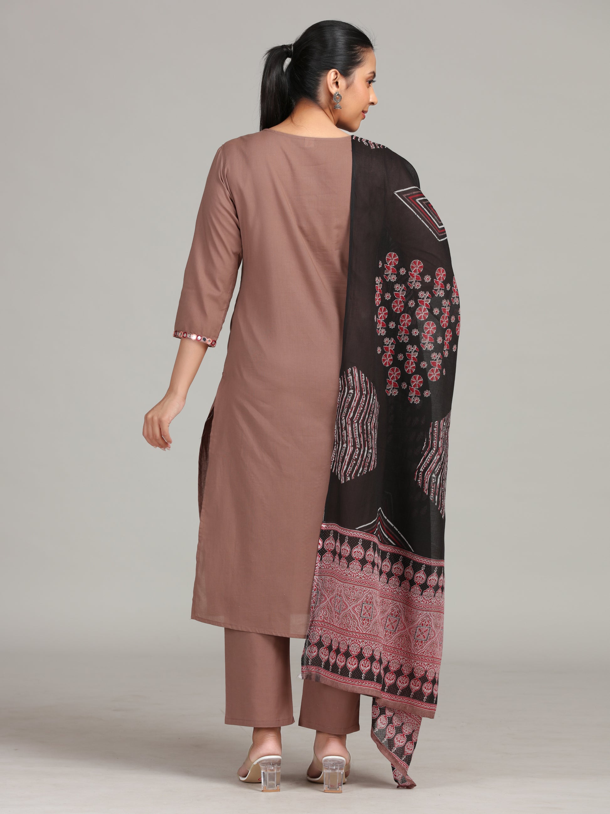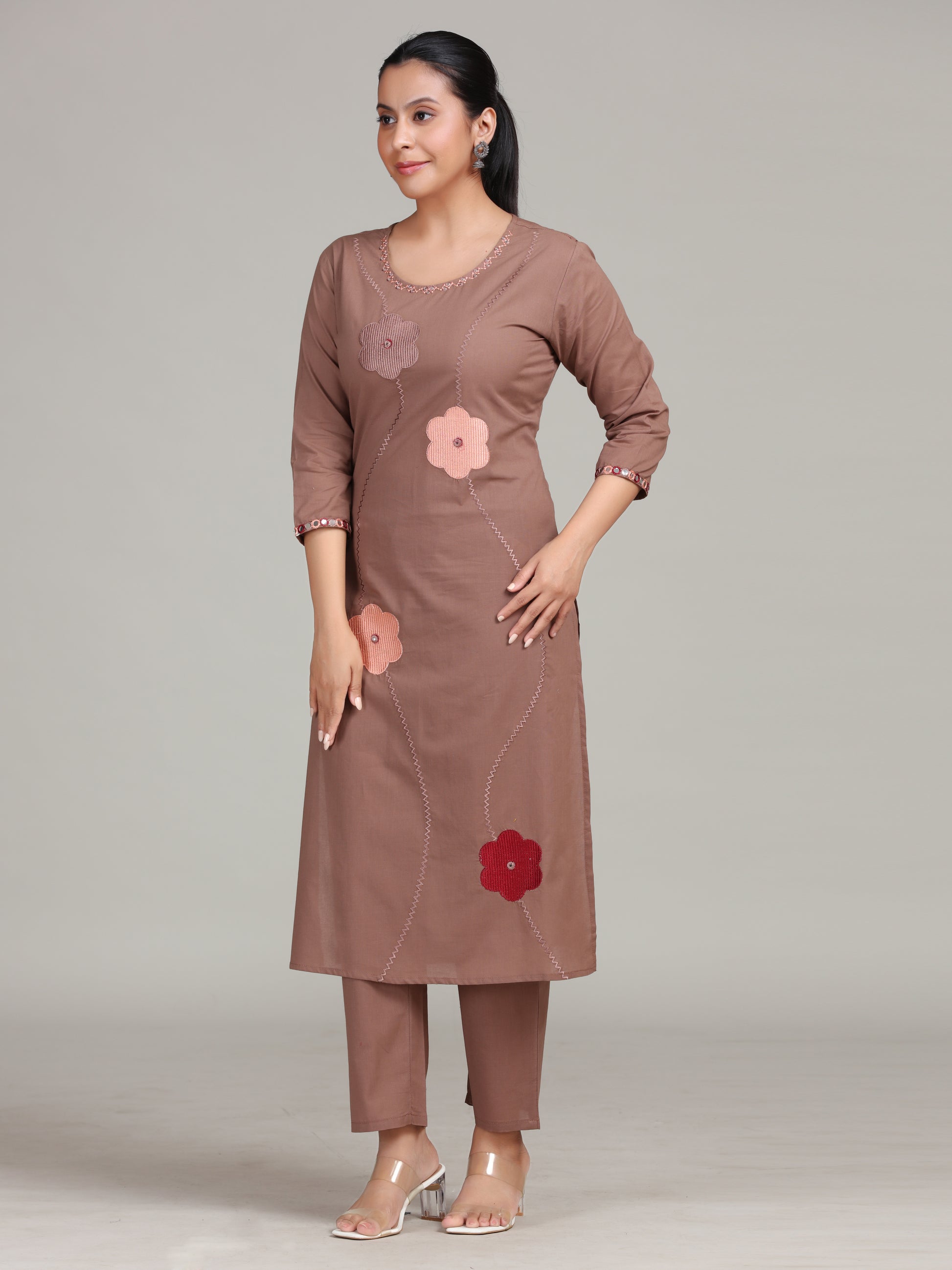 Dusty Rose Floral Embroidered Straight Cotton Ethnic Set