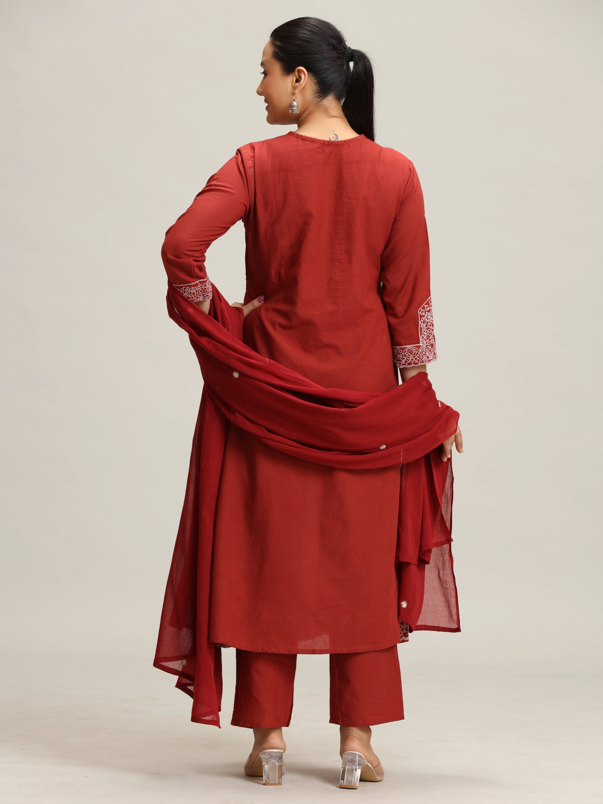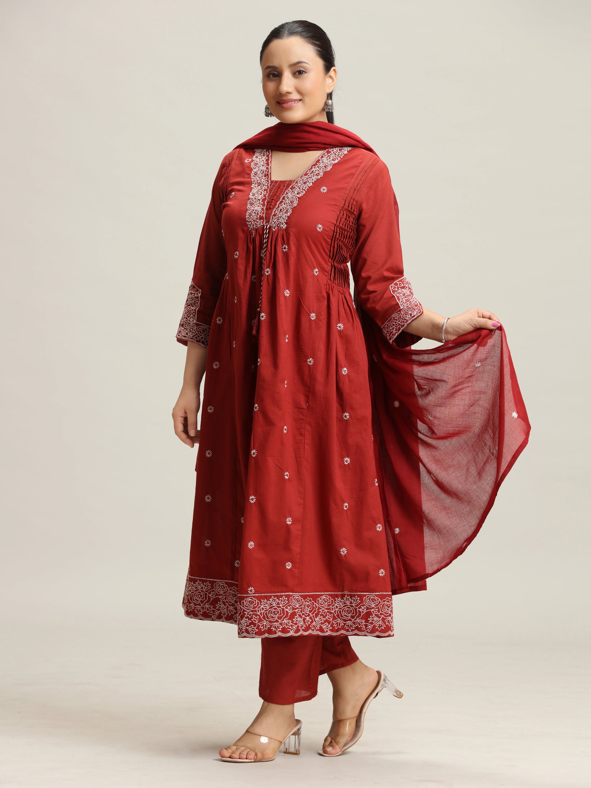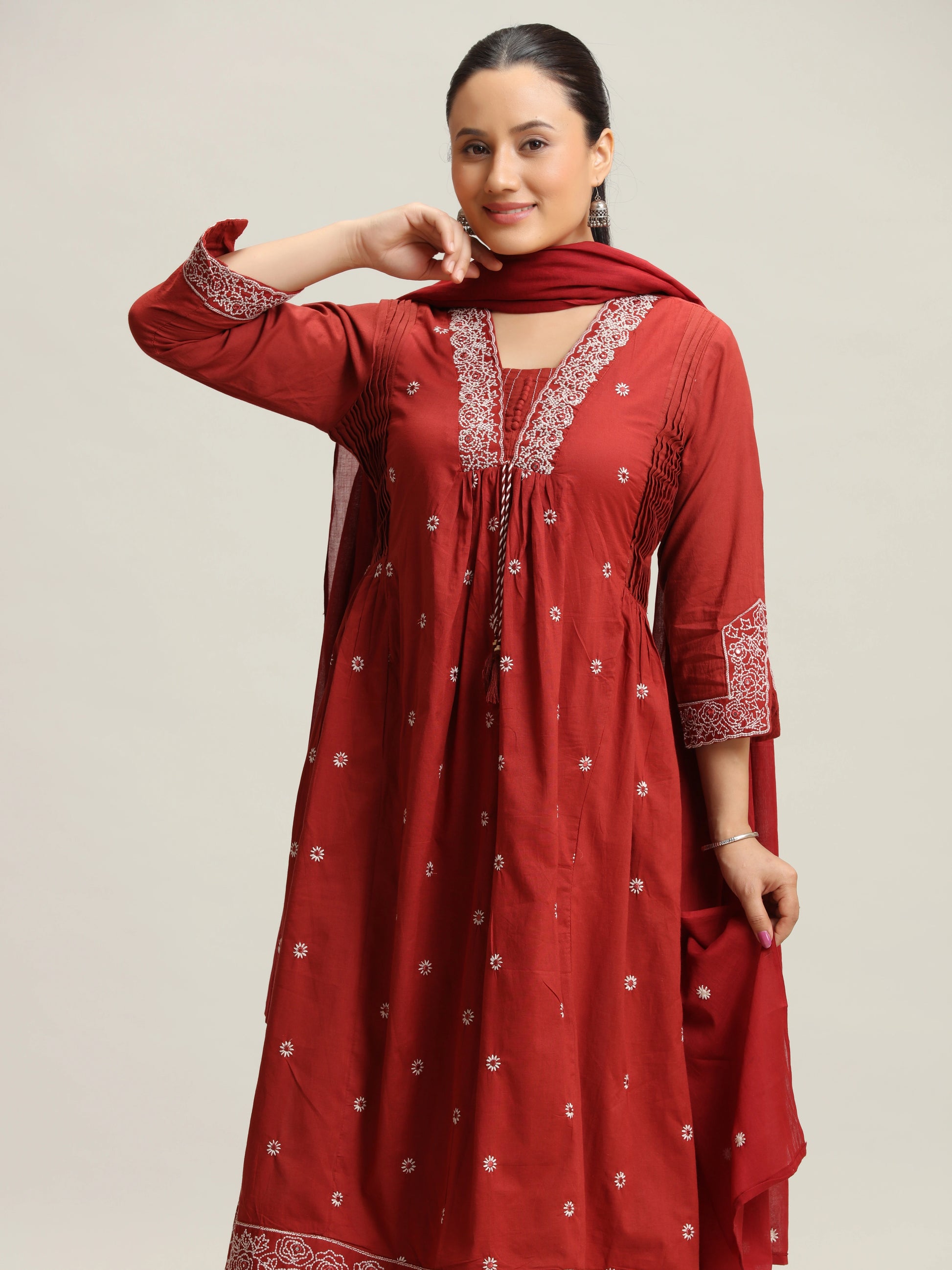 Maroon Chikankari Flared Ethnic Set