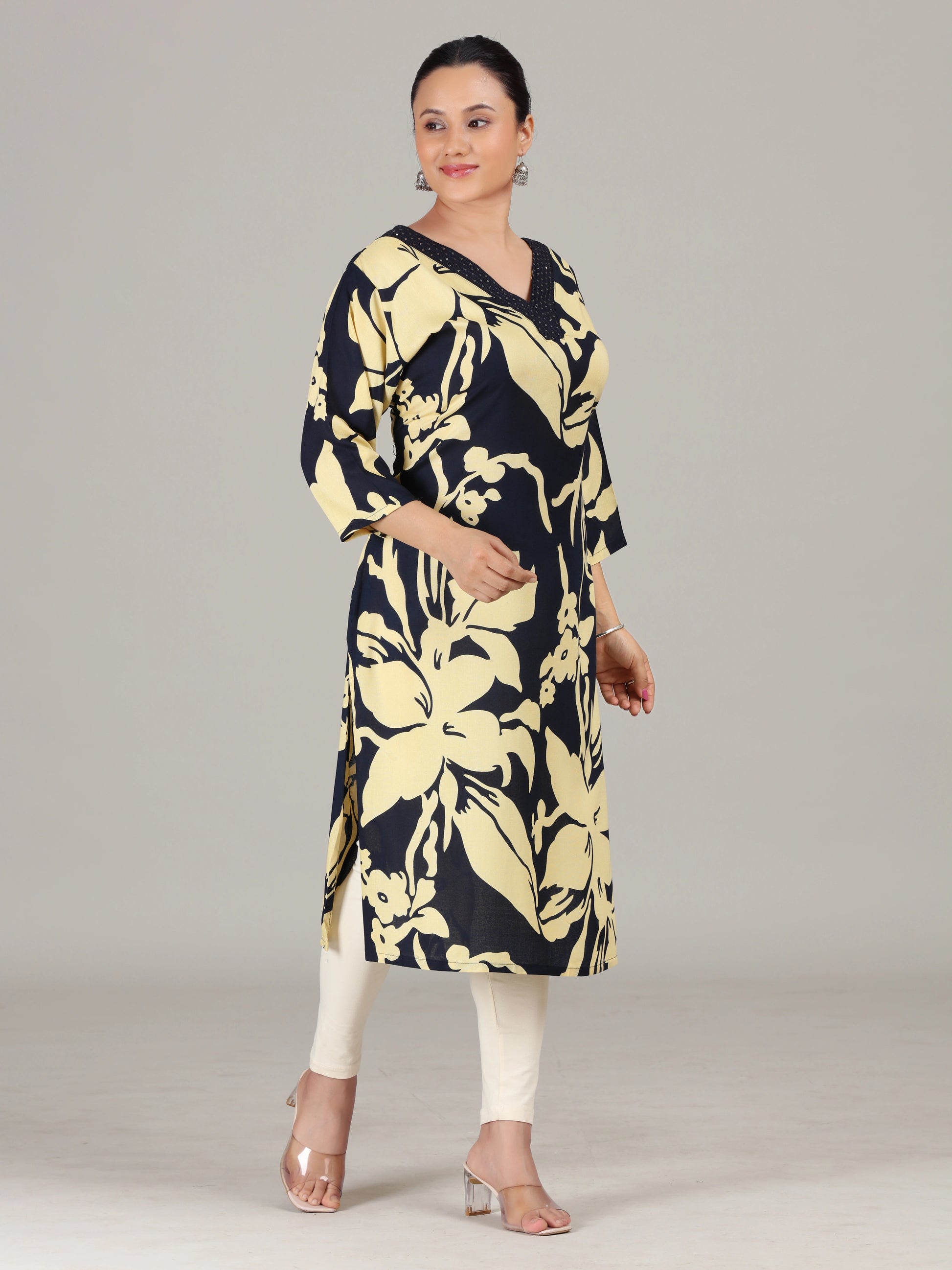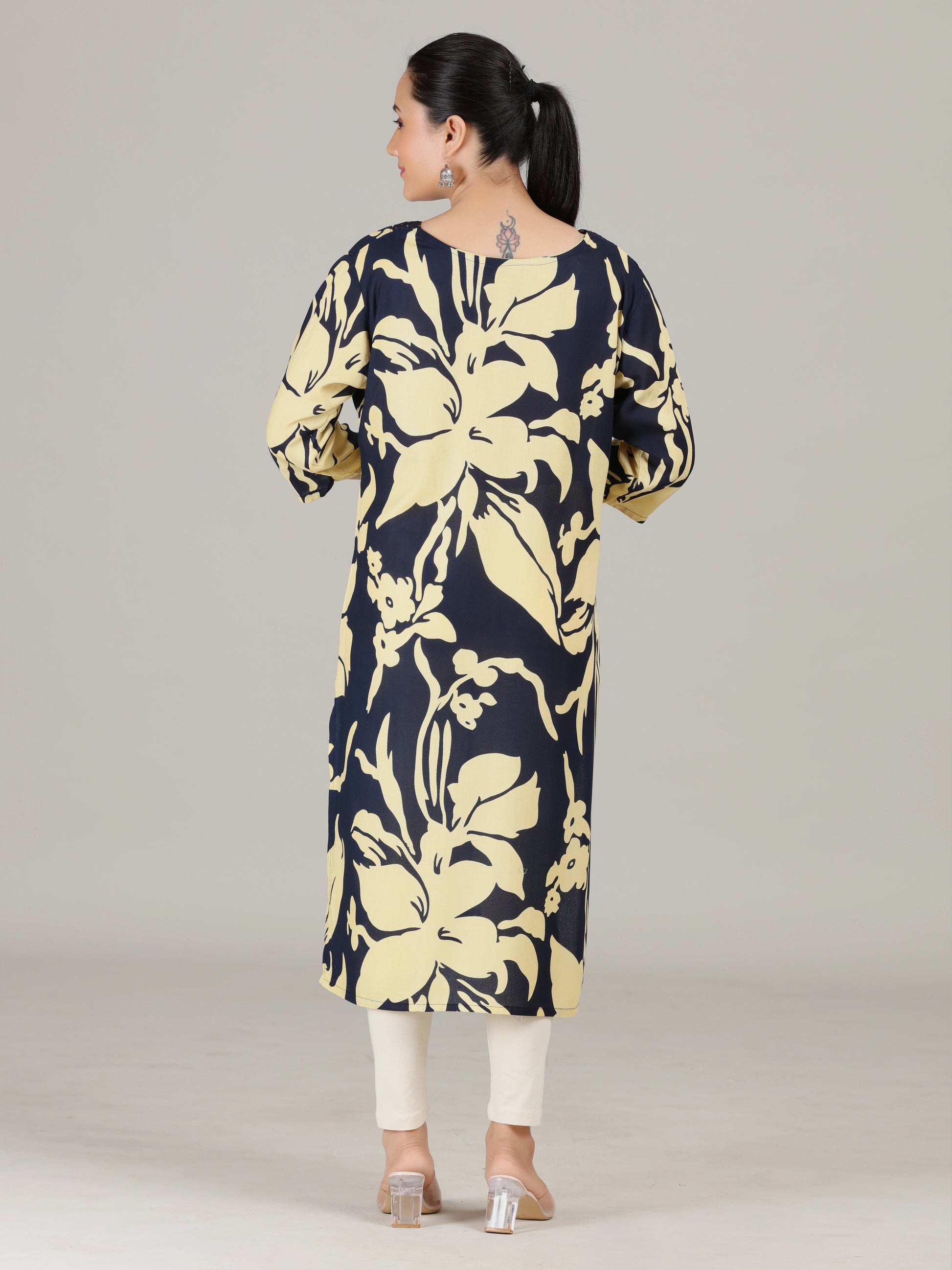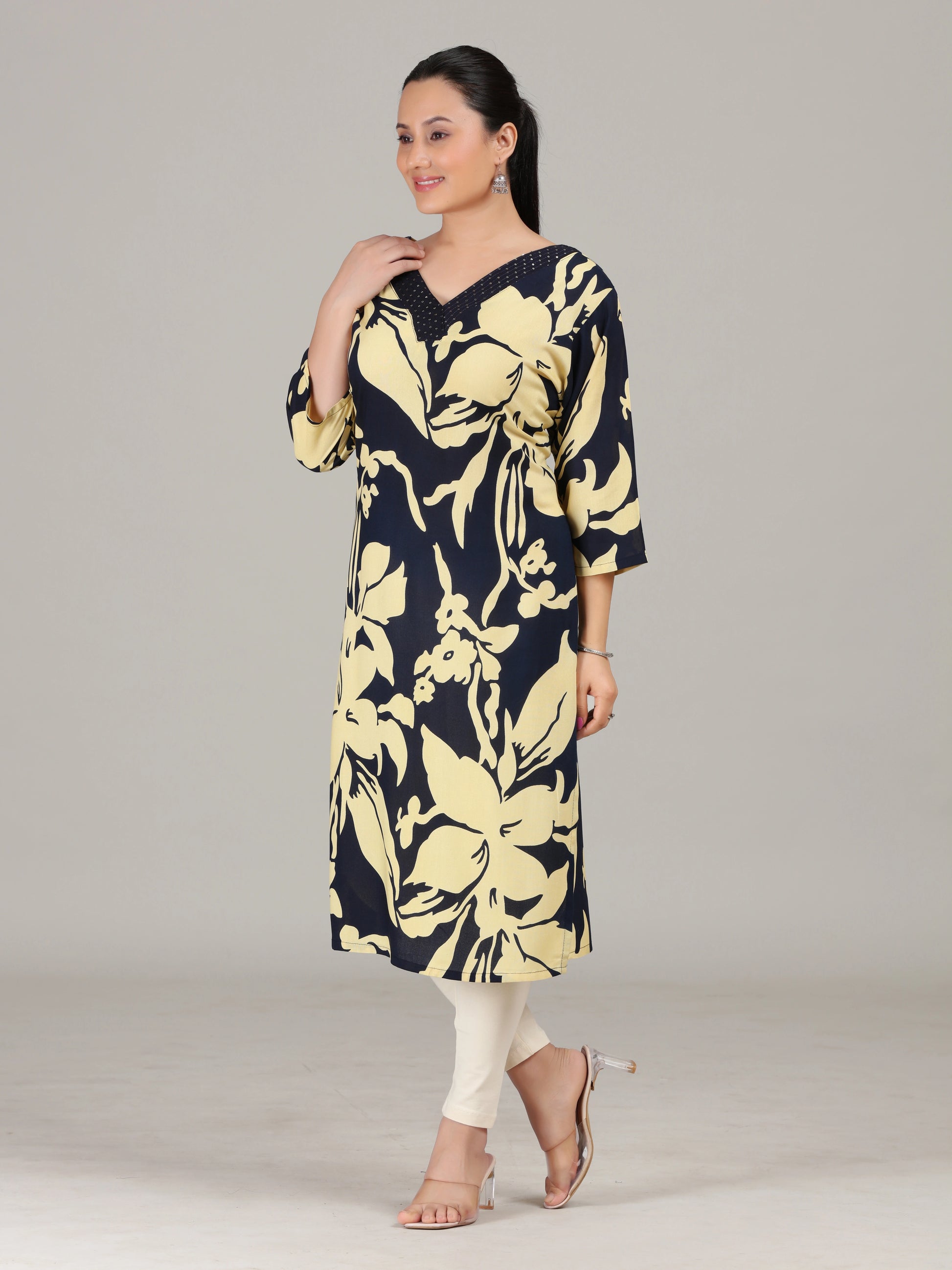 Navy Blue Floral Embroidered Straight Kurta