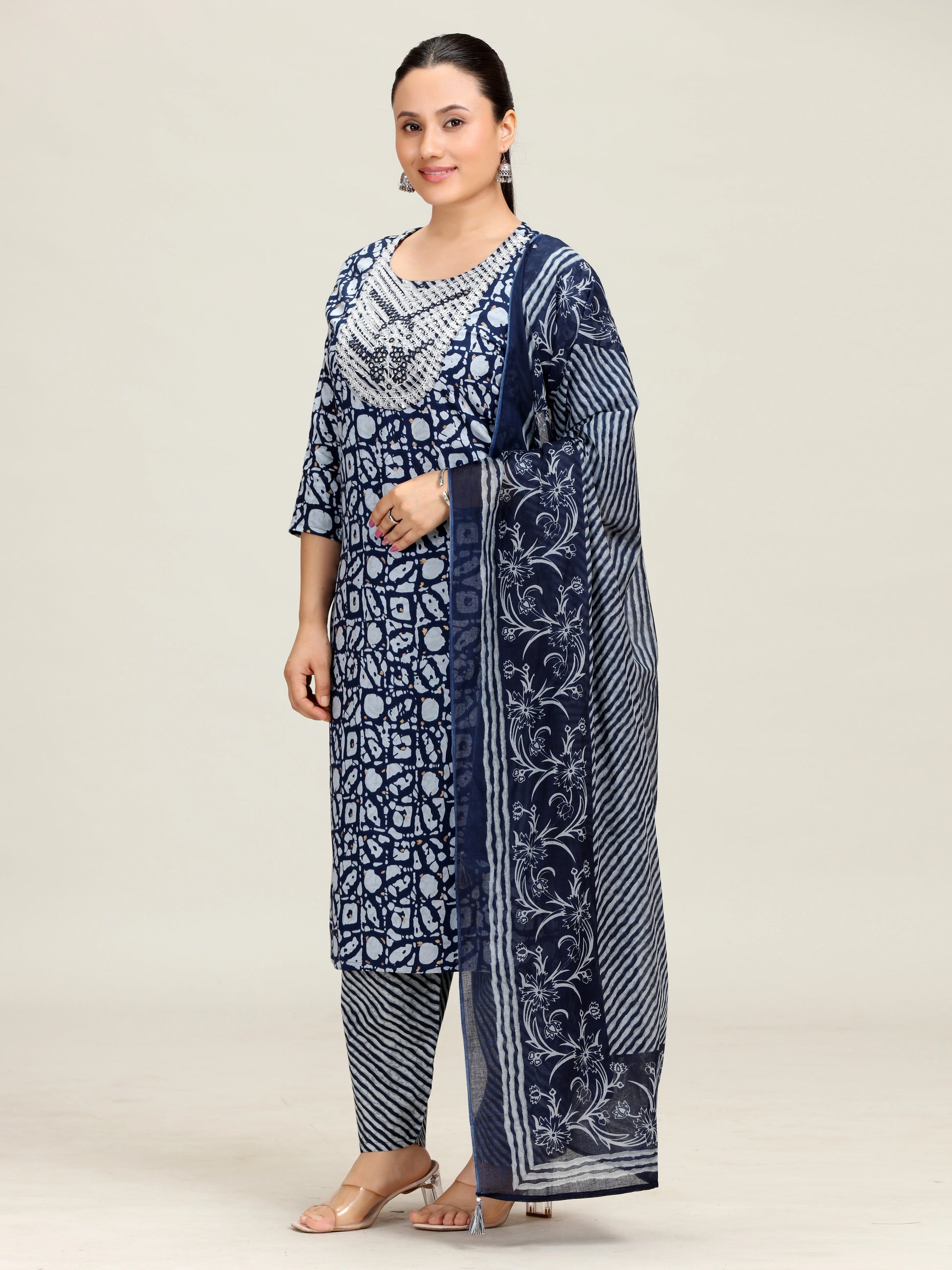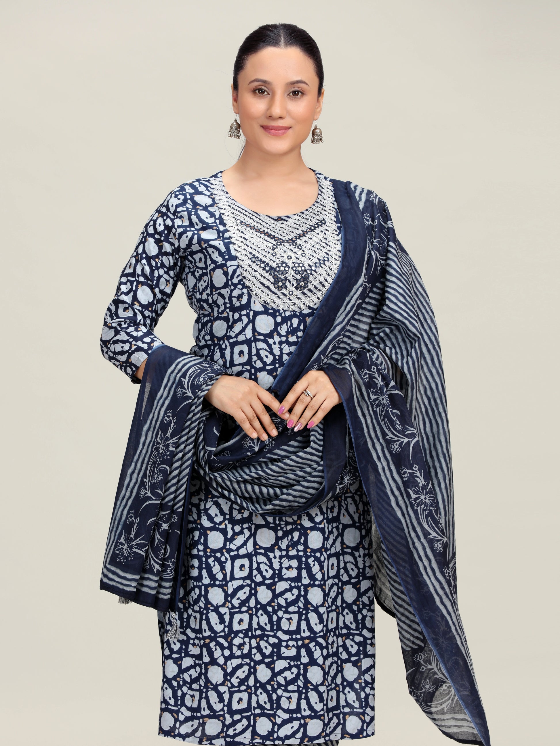Navy Blue Printed Embroidered Straight Cotton Ethnic Set