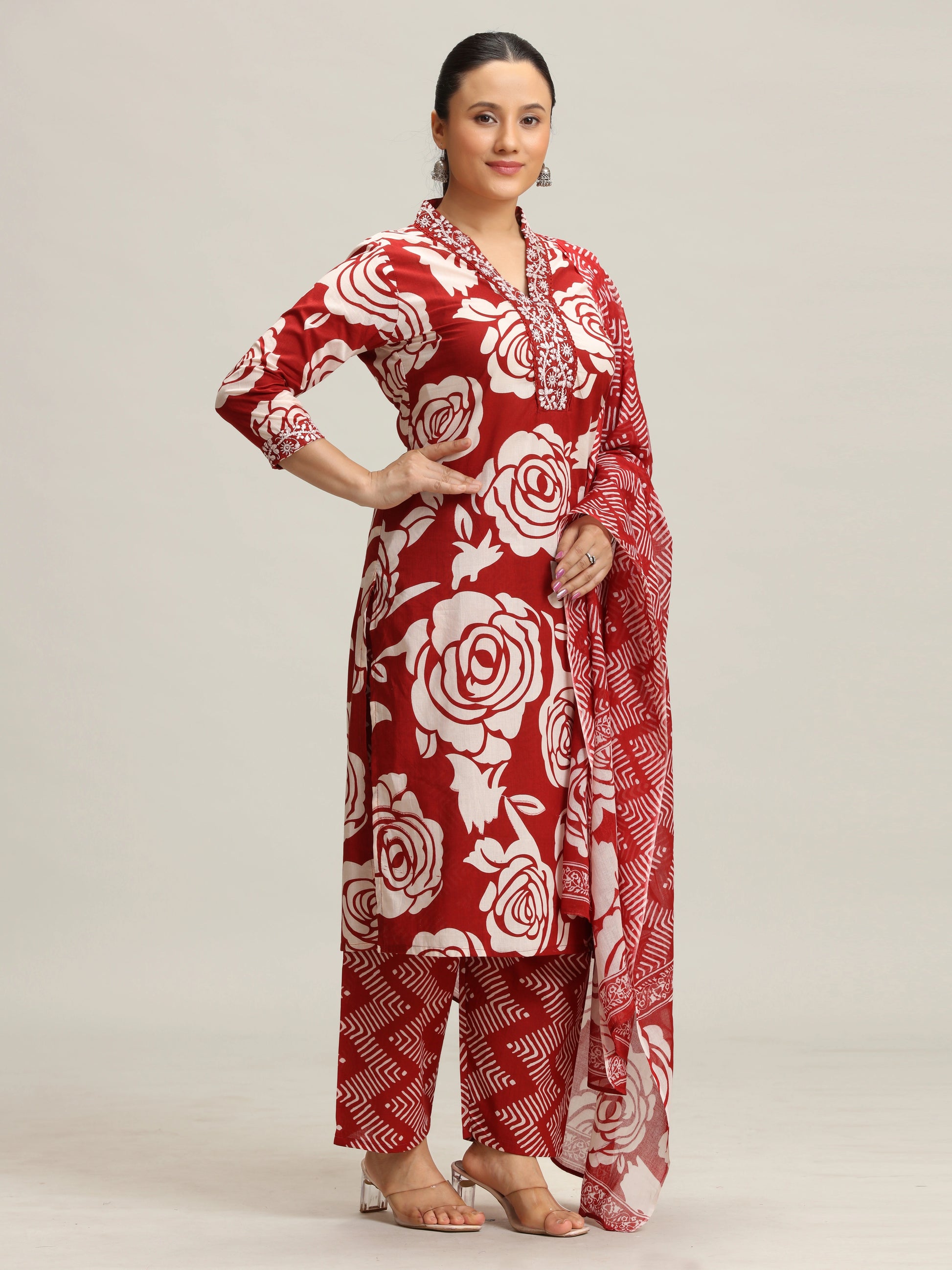 Red Floral Embroidered Straight Ethnic Set